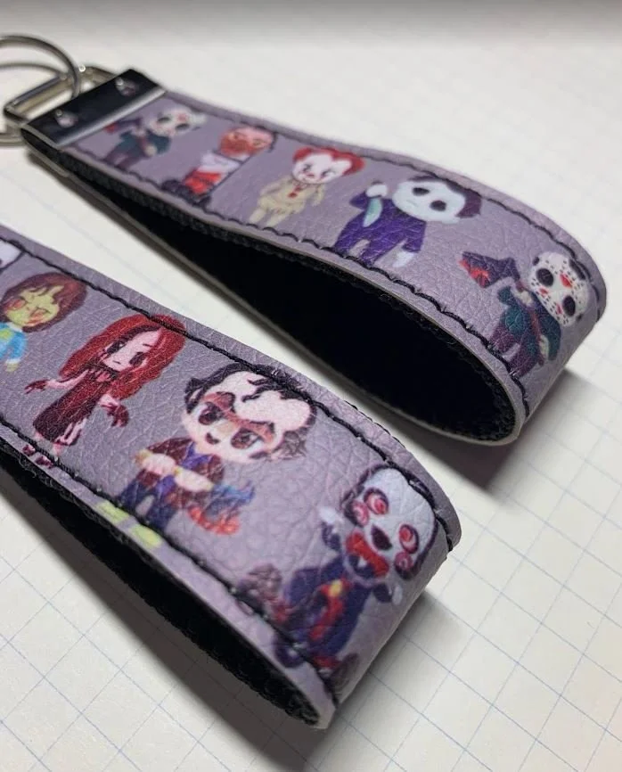 These key fobs are made with lightweight specialty printed vinyl. Each key fob has 1" silver metal hardware attached with a 1" split key ring connected to it. These are the standard Key Fob measuring approximately 1" wide and 4" long.